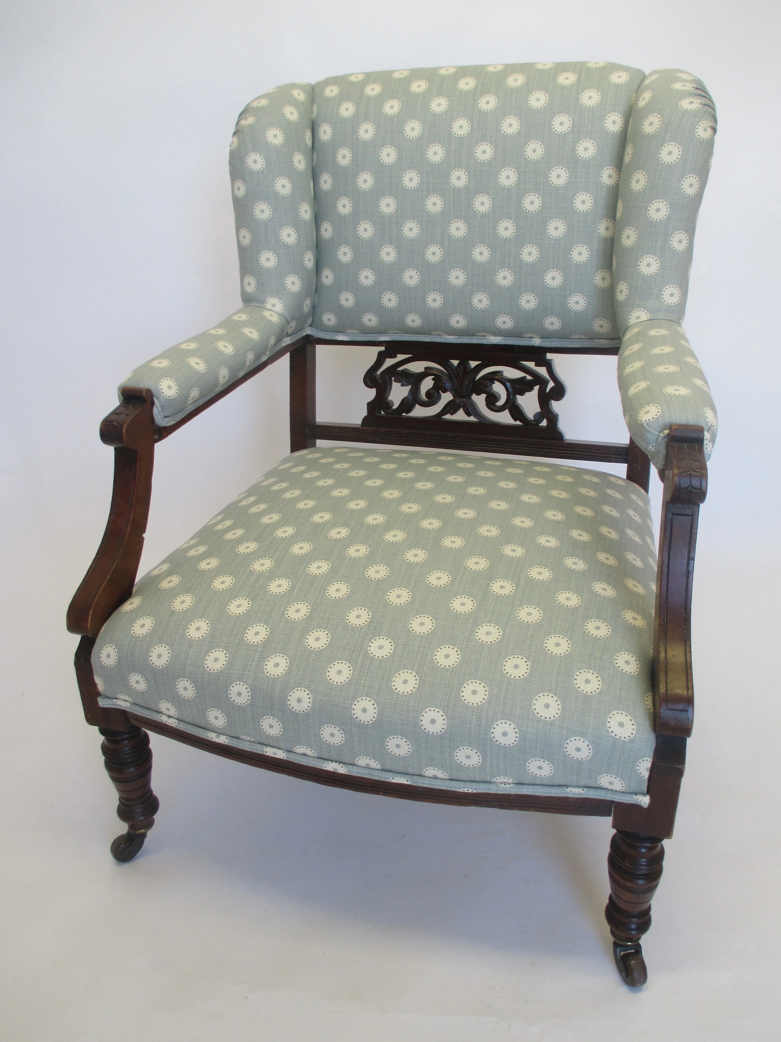 This chair is covered in 'Pretty Maids' by Vanessa Arbuthnott. The fabric is light and fresh and lifts the chair letting the detailing in the wood stand out.